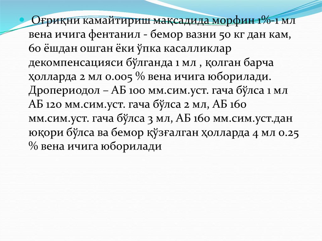 Оғриқни камайтириш мақсадида морфин 1%-1 млвена ичига фентанил - бемор вазни 50 кг дан кам,