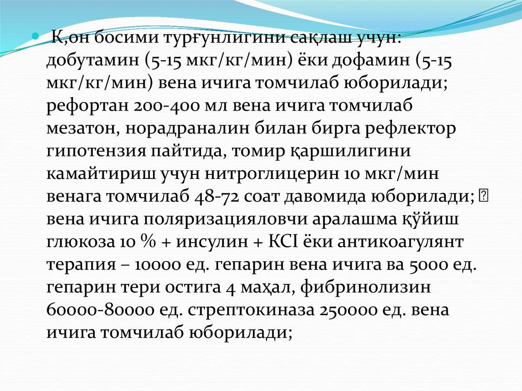 К,он босими турғунлигини сақлаш учун:добутамин (5-15 мкг/кг/мин) ёки дофамин (5-15