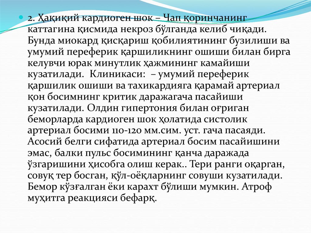 2. Ҳақиқий кардиоген шок – Чап қоринчанингкаттагина қисмида некроз бўлганда келиб чиқади.