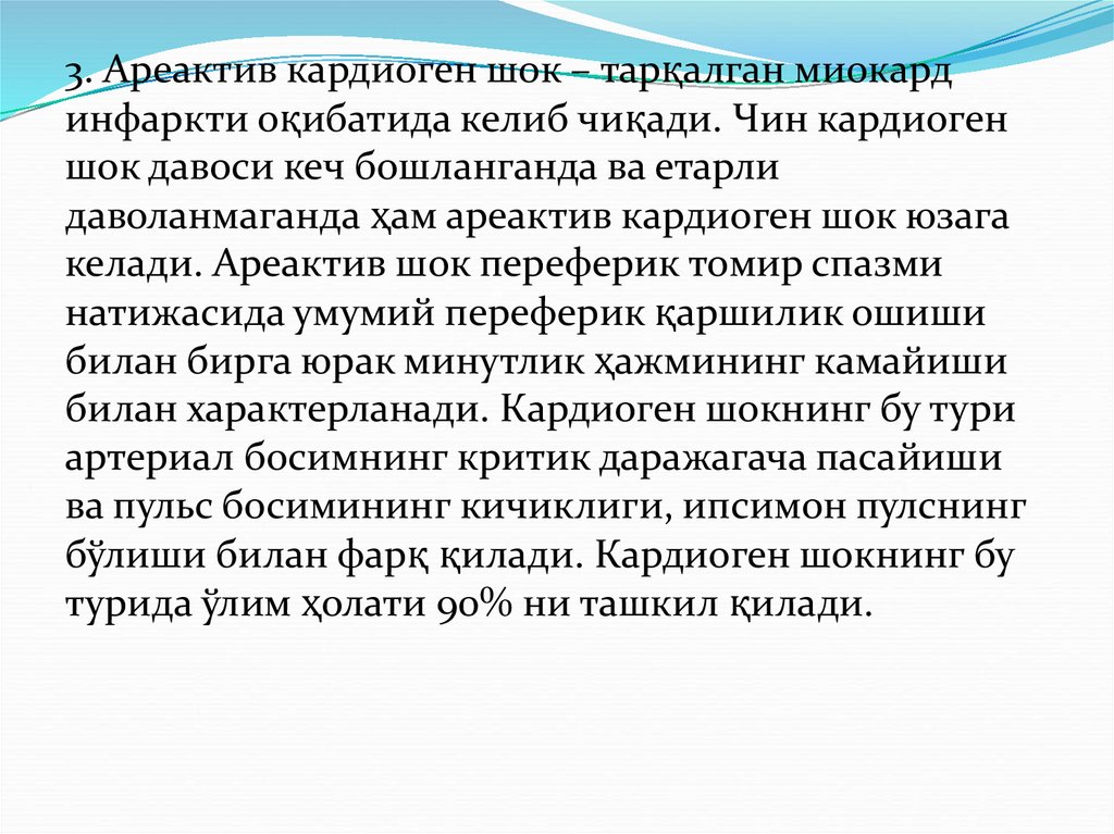3. Ареактив кардиоген шок – тарқалган миокардинфаркти оқибатида келиб чиқади. Чин кардиоген