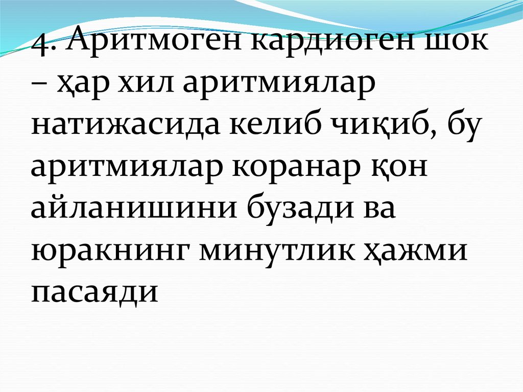 4. Аритмоген кардиоген шок– ҳар хил аритмиялар