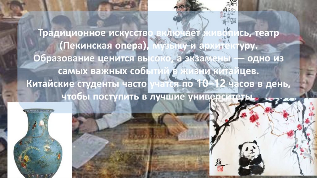 Традиционное искусство включает живопись, театр(Пекинская опера), музыку и архитектуру.
