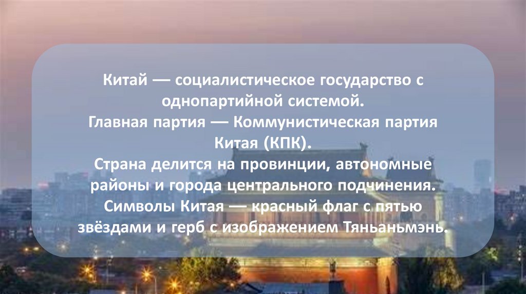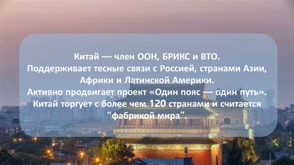 Китай — член ООН, БРИКС и ВТО.Поддерживает тесные связи с Россией, странами Азии,