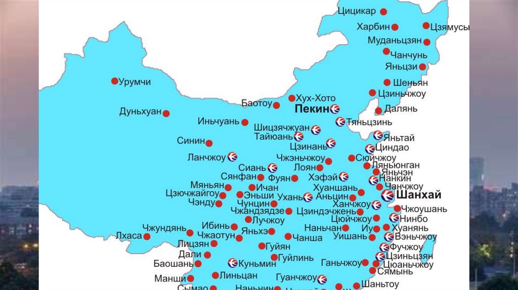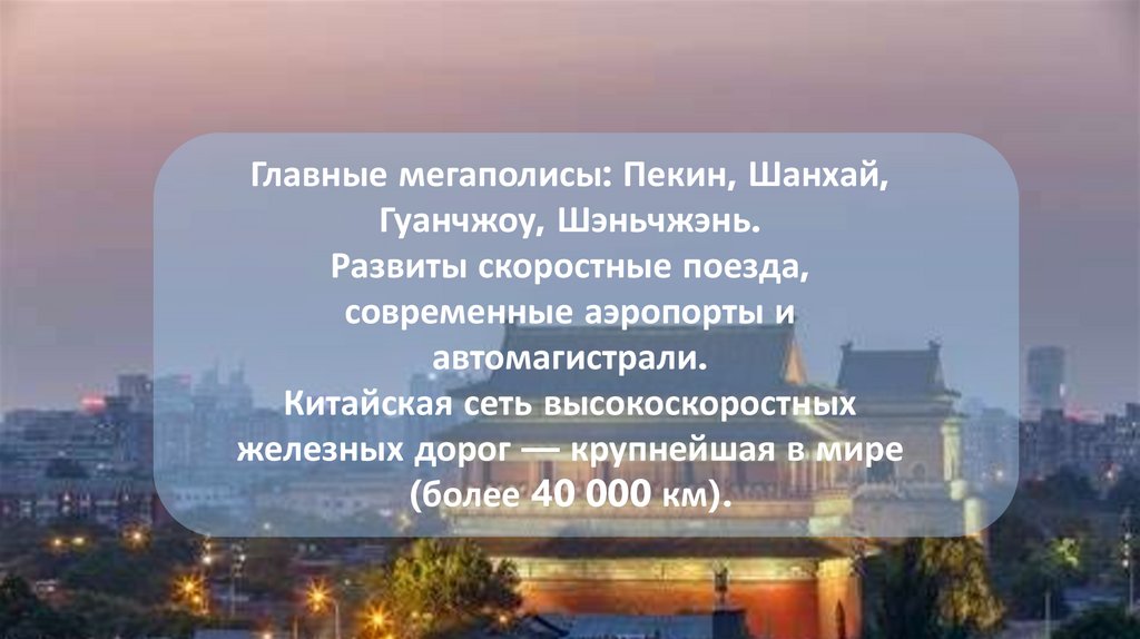 Главные мегаполисы: Пекин, Шанхай,Гуанчжоу, Шэньчжэнь.