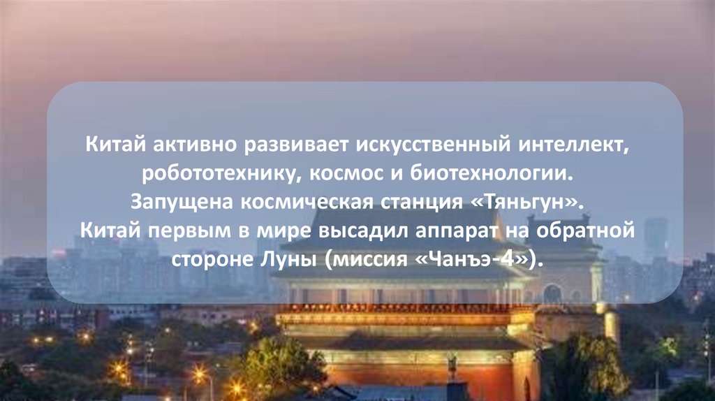Китай активно развивает искусственный интеллект,робототехнику, космос и биотехнологии.
