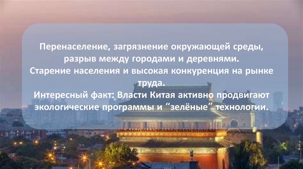 Перенаселение, загрязнение окружающей среды,разрыв между городами и деревнями.