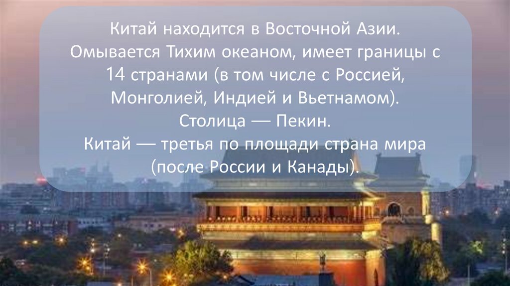 Китай находится в Восточной Азии.Омывается Тихим океаном, имеет границы с