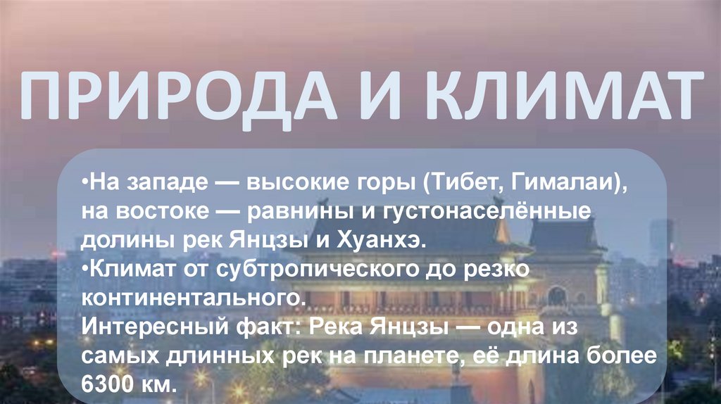 ПРИРОДА И КЛИМАТ•На западе — высокие горы (Тибет, Гималаи),