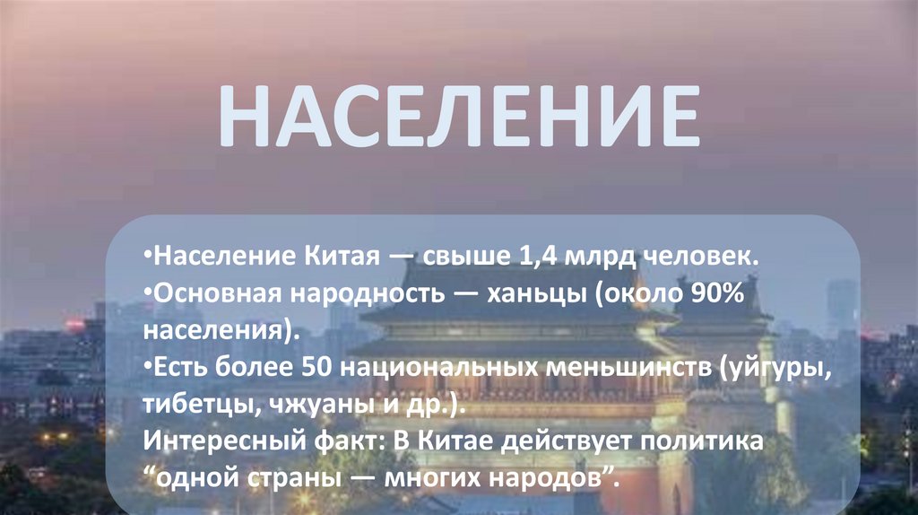 НАСЕЛЕНИЕ•Население Китая — свыше 1,4 млрд человек.