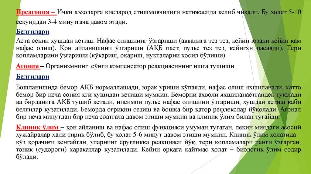 Преагония – Ички аъзоларга кисларод етишмовчилиги натижасида келиб чиқади. Бу холат 5-10секунддан 3-4 минутгача давом этади.