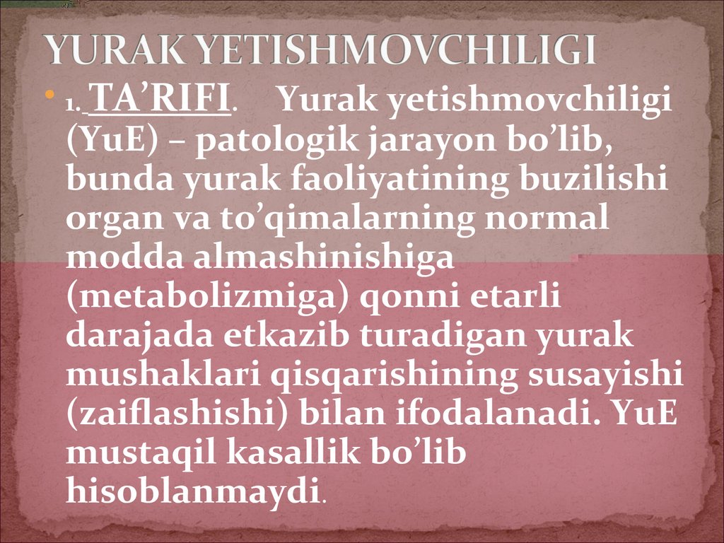 (1) Yurak mushagining juda toliqishi:yurak nuqsonlarida, artеriya