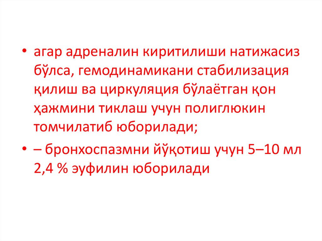 • агар адреналин киритилиши натижасизбўлса, гемодинамикани стабилизация