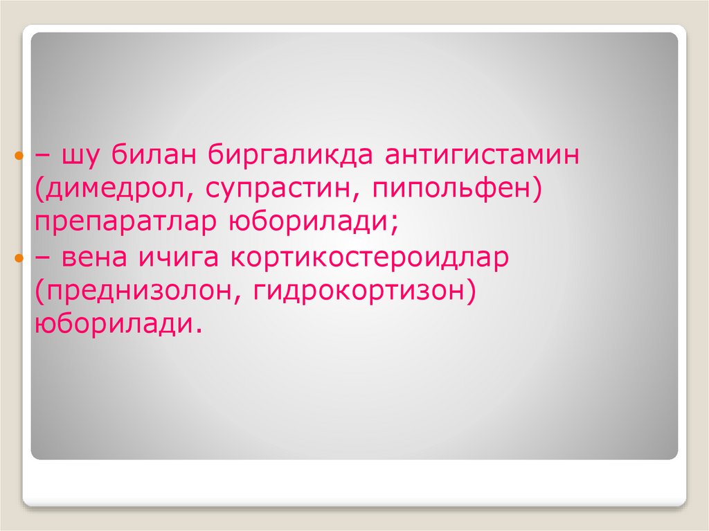 – шу билан биргаликда антигистамин(димедрол, супрастин, пипольфен)