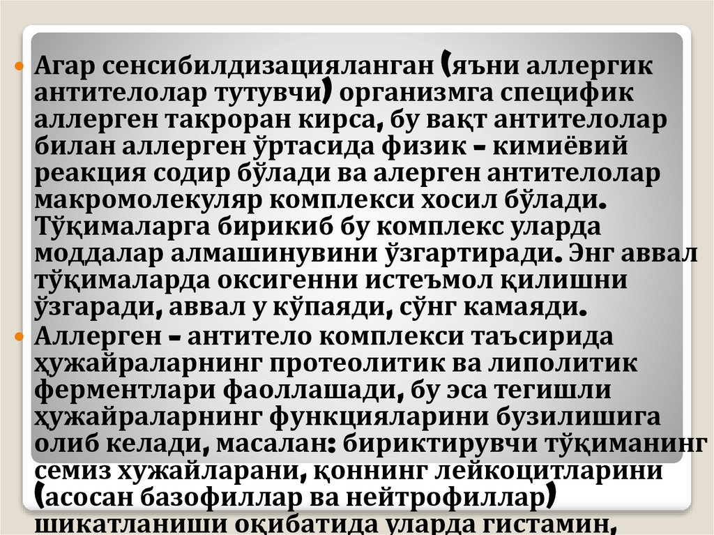 Агар сенсибилдизацияланган (яъни аллергикантителолар тутувчи) организмга специфик
