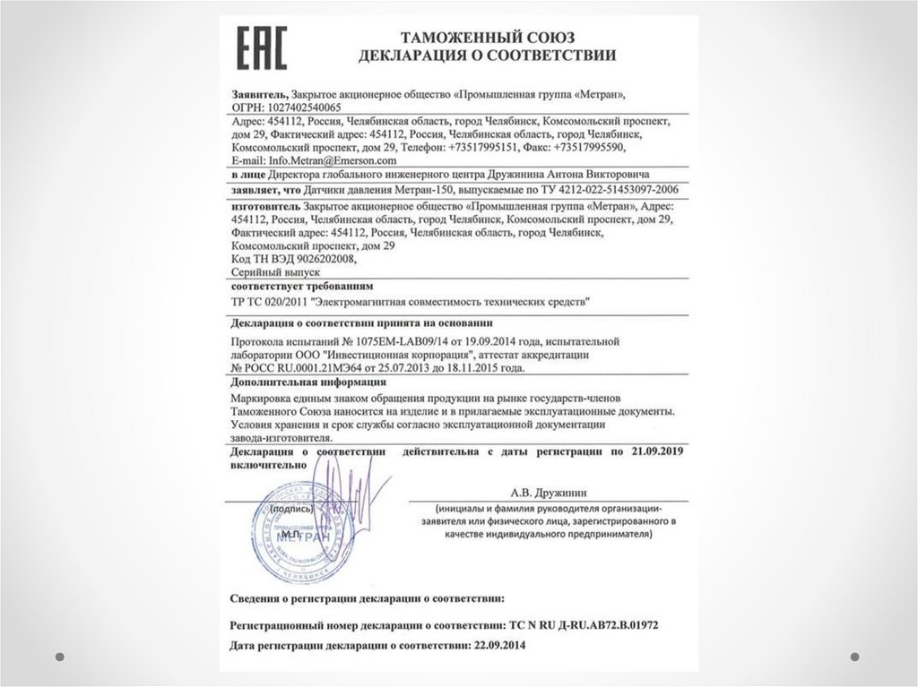 Декларация на датчики давления Метран-150 есть официальныйдокумент, констатирующий соответствие товара положениям