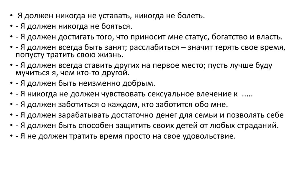 • Отношения сводятся к невротической «работе» над отношениями.Прибывают в отношениях, которые доставляют им страдания, но выйти