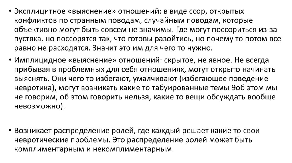 • Имплицидное «выяснение» отношений: скрытое, не явное. Не всегда