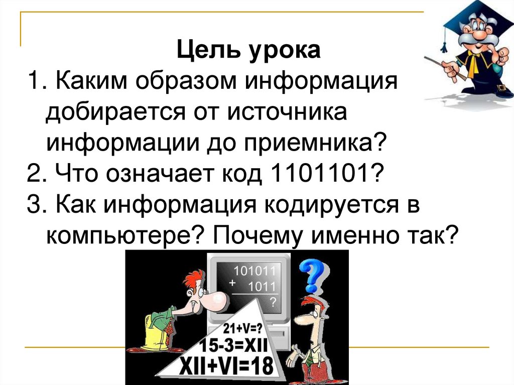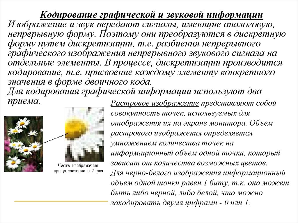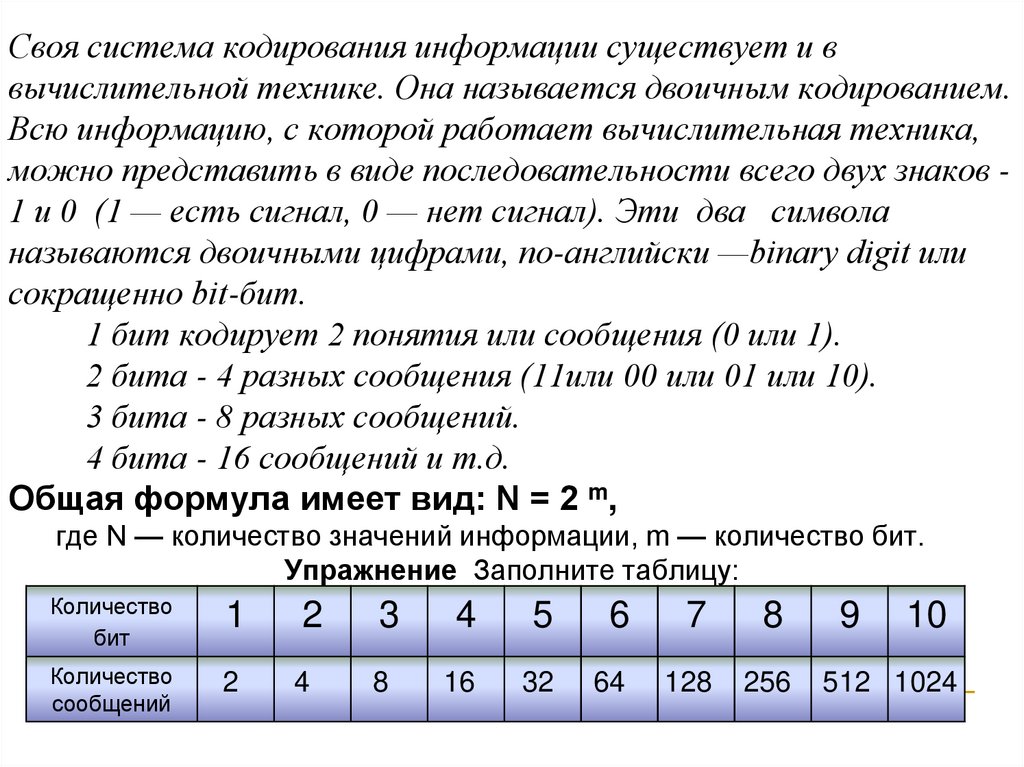 можно представить в виде последовательности всего двух знаков 1 и 0 (1 — есть сигнал, 0 — нет сигнал). Эти два символа