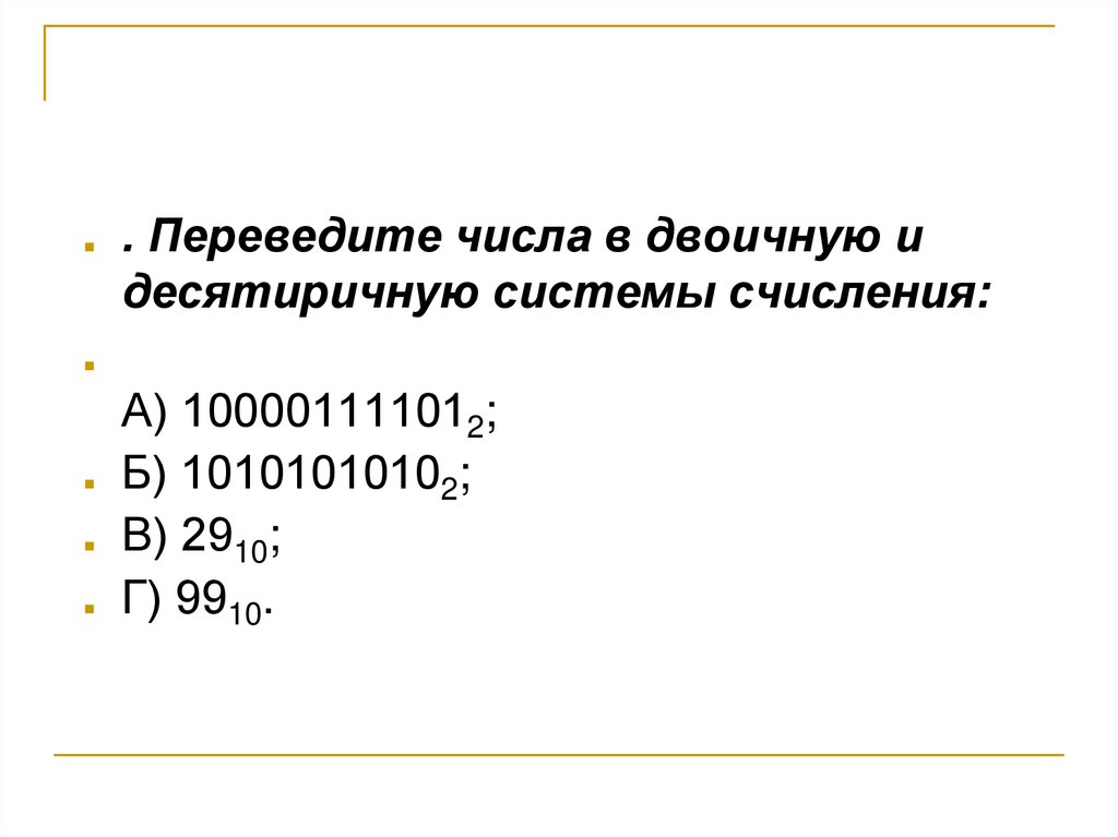 чисел из десятичной системы счисления в двоичную и наоборот.