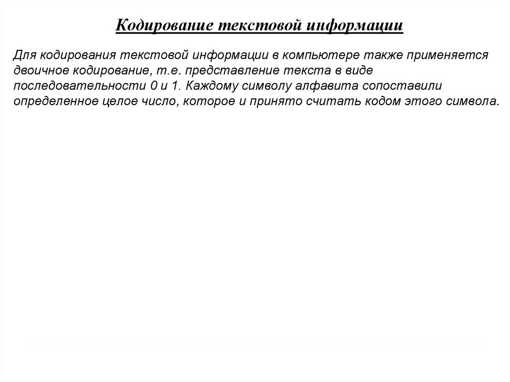 Кодирование текстовой информацииДля кодирования текстовой информации в компьютере также применяется