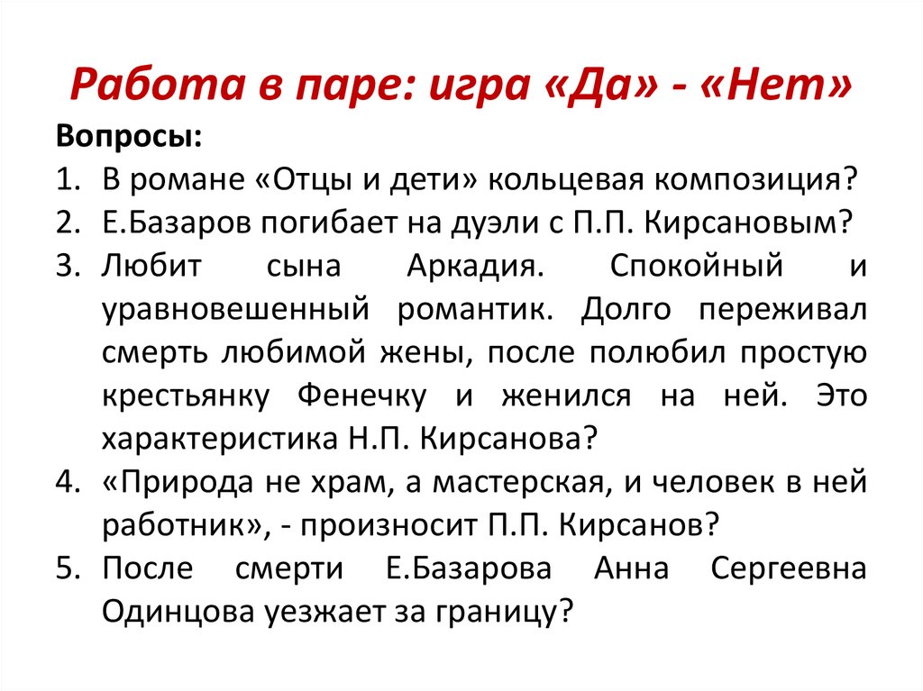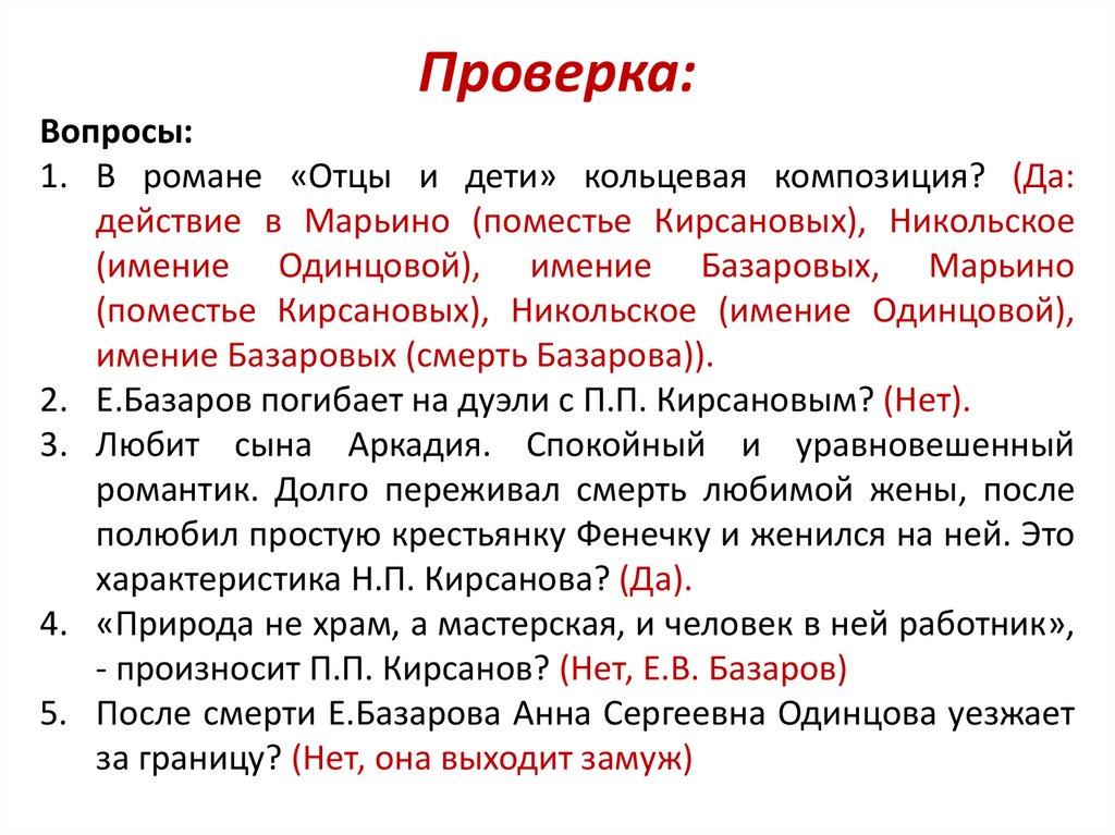 1. В романе «Отцы и дети» кольцевая композиция? (Да: