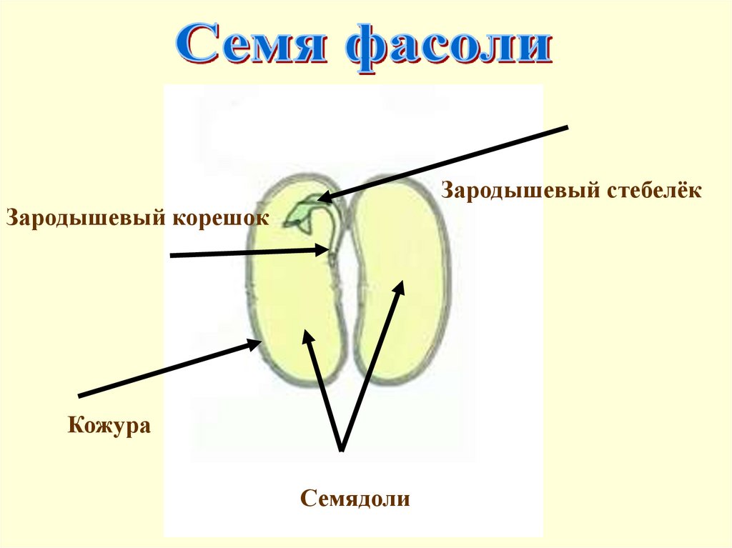 1. У семени фасоли наибольшую массу имеют семядоли.2. Все семена имеют по две семядоли и эндосперм.