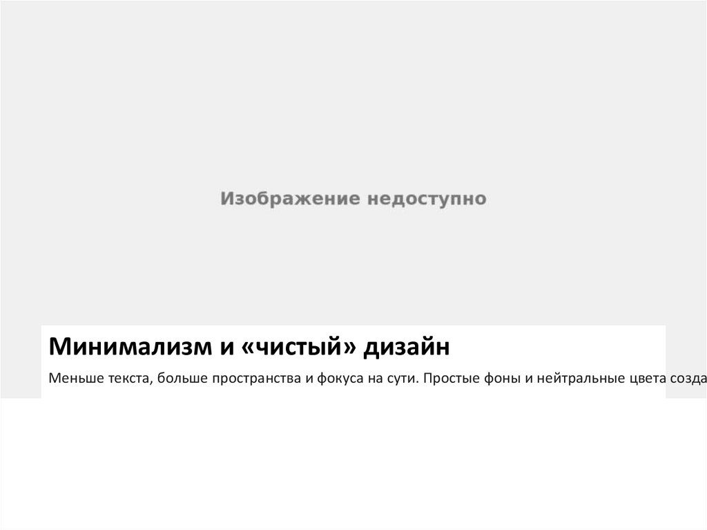 Минимализм и «чистый» дизайнМеньше текста, больше пространства и фокуса на сути. Простые фоны и нейтральные цвета создаю