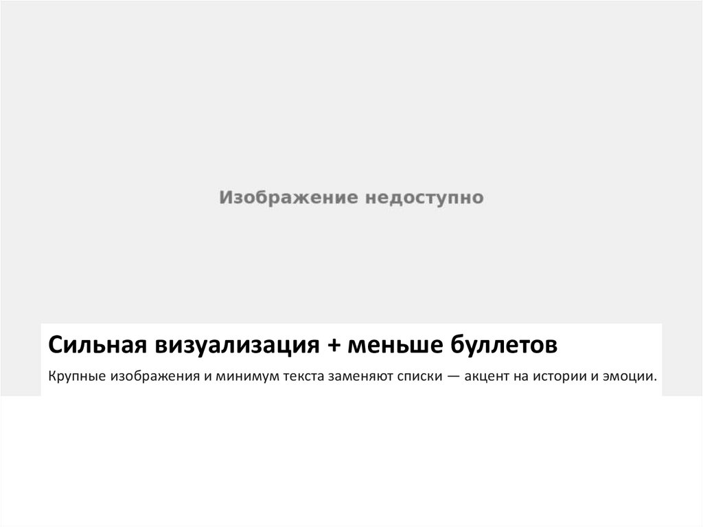 Сильная визуализация + меньше буллетовКрупные изображения и минимум текста заменяют списки — акцент на истории и эмоции.