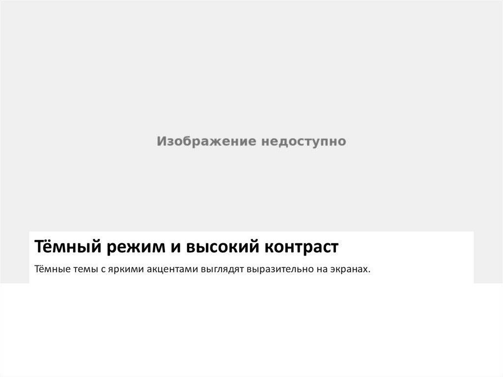 Тёмный режим и высокий контрастТёмные темы с яркими акцентами выглядят выразительно на экранах.