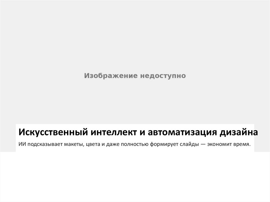 Искусственный интеллект и автоматизация дизайнаИИ подсказывает макеты, цвета и даже полностью формирует слайды — экономит время.