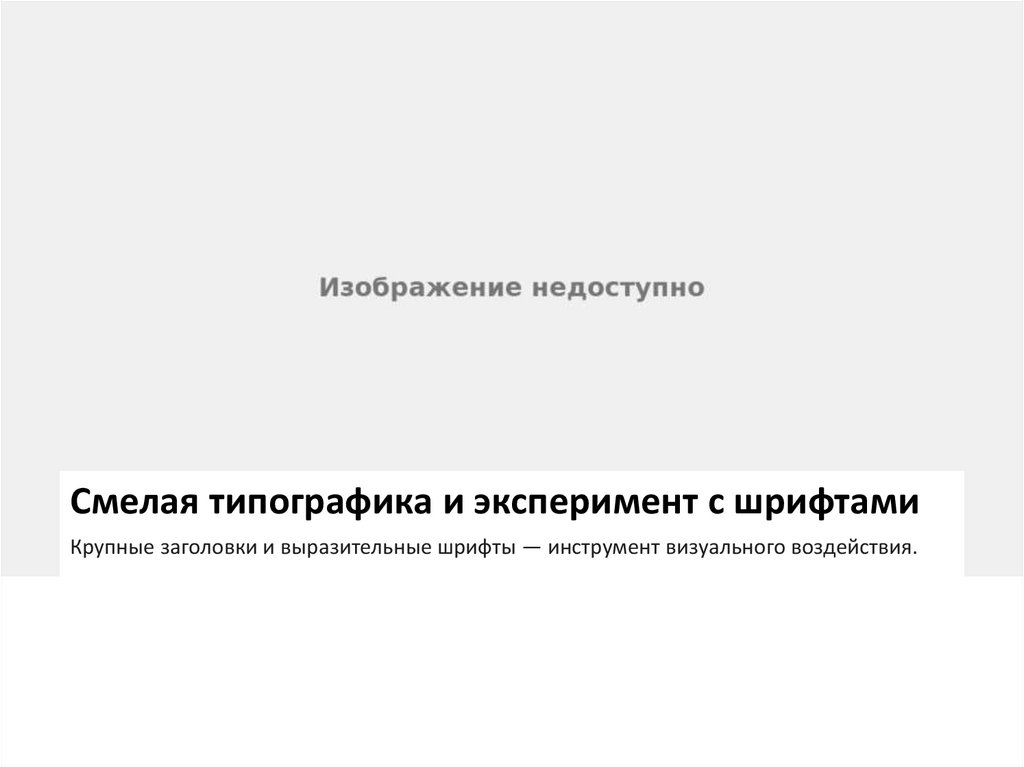 Смелая типографика и эксперимент с шрифтамиКрупные заголовки и выразительные шрифты — инструмент визуального воздействия.