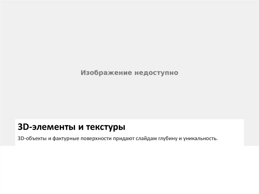 3D-элементы и текстуры3D-объекты и фактурные поверхности придают слайдам глубину и уникальность.