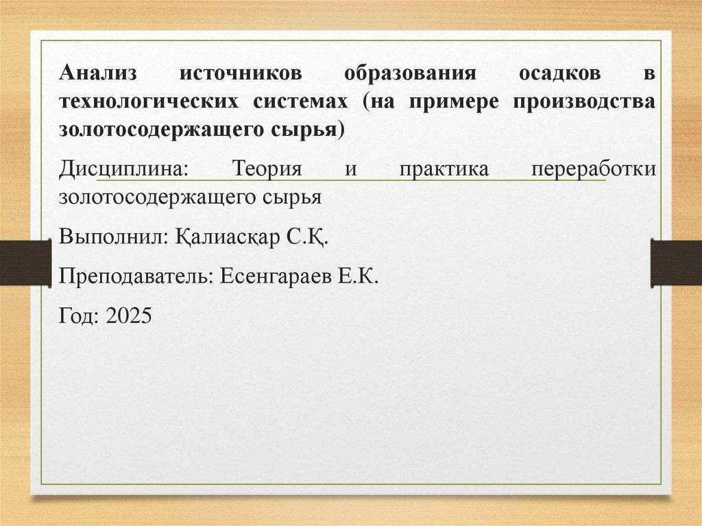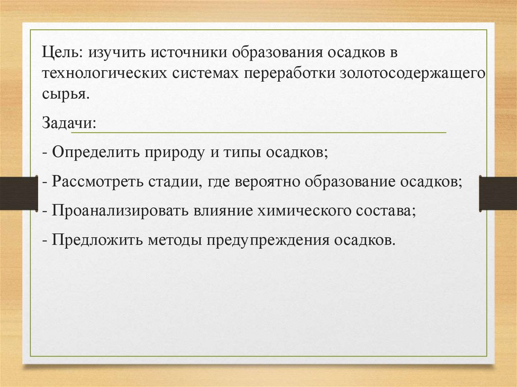 Цель: изучить источники образования осадков втехнологических системах переработки золотосодержащего