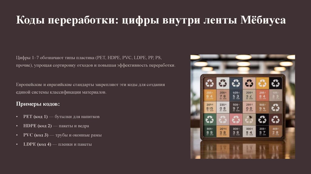 Коды переработки: цифры внутри ленты МёбиусаЦифры 1–7 обозначают типы пластика (PET, HDPE, PVC, LDPE, PP, PS,