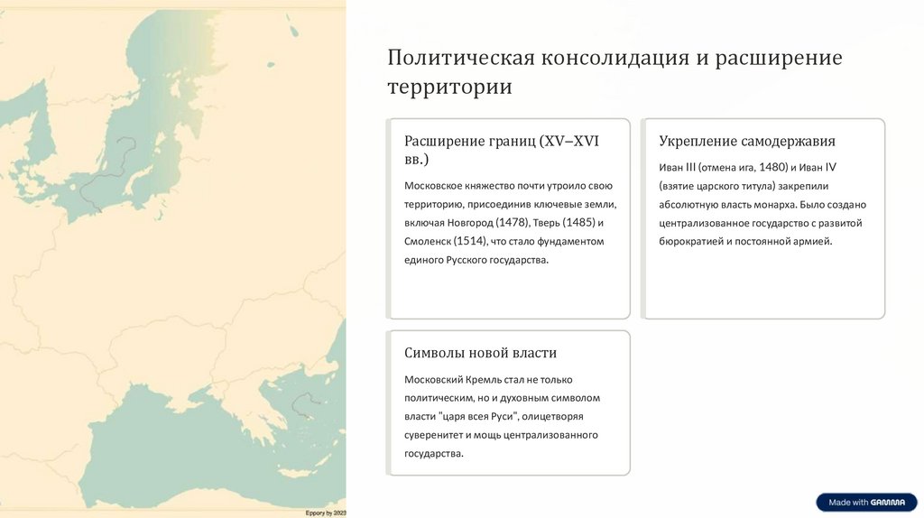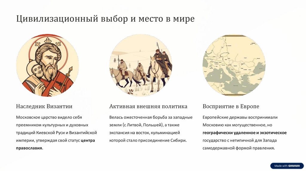 Политическая, экономическая и культурная системы, сформированные в Московском царстве, стали неотъемлемой базой для