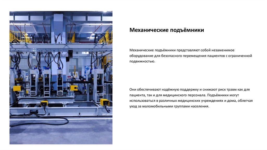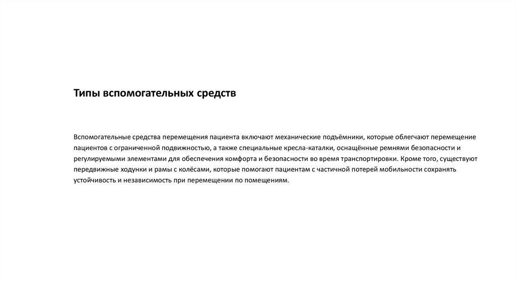 Типы вспомогательных средствВспомогательные средства перемещения пациента включают механические подъёмники, которые облегчают перемещение