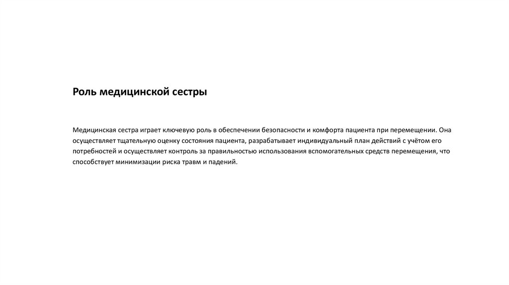 Роль медицинской сестрыМедицинская сестра играет ключевую роль в обеспечении безопасности и комфорта пациента при перемещении. Она