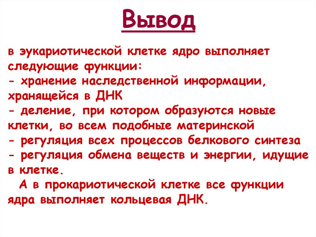 Выводв эукариотической клетке ядро выполняет