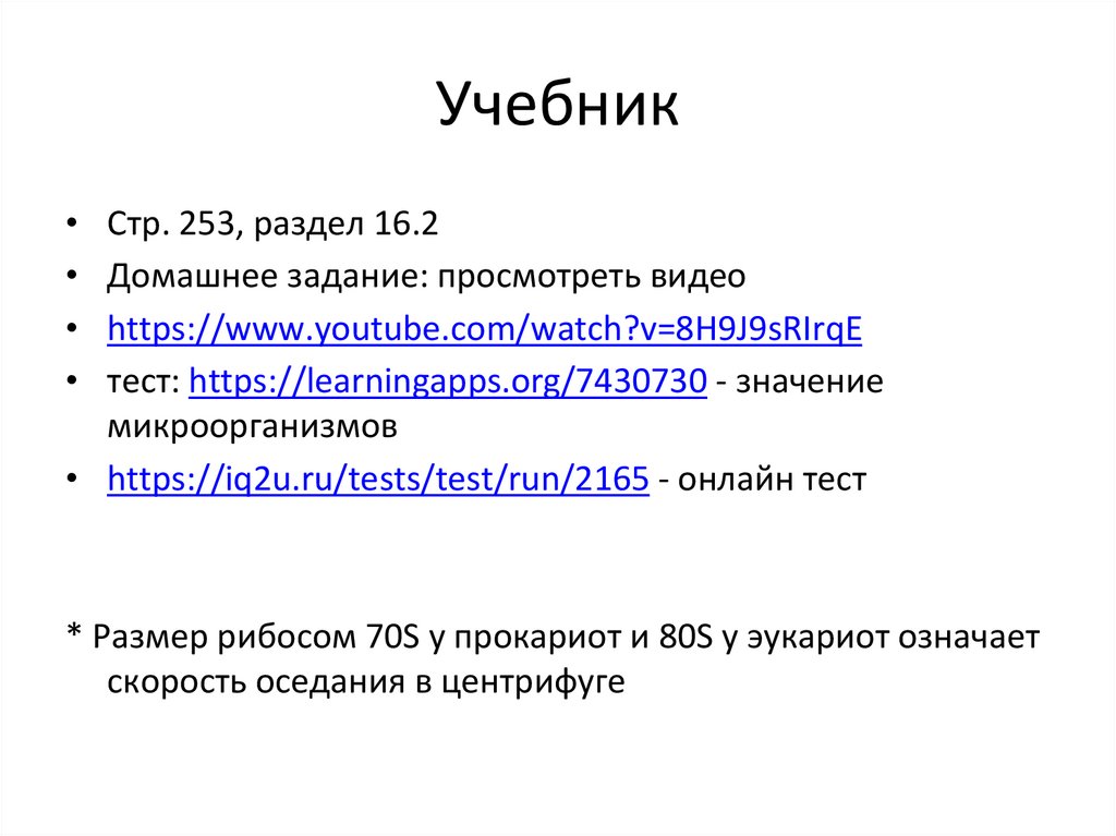 * Размер рибосом 70S у прокариот и 80S у эукариот означает