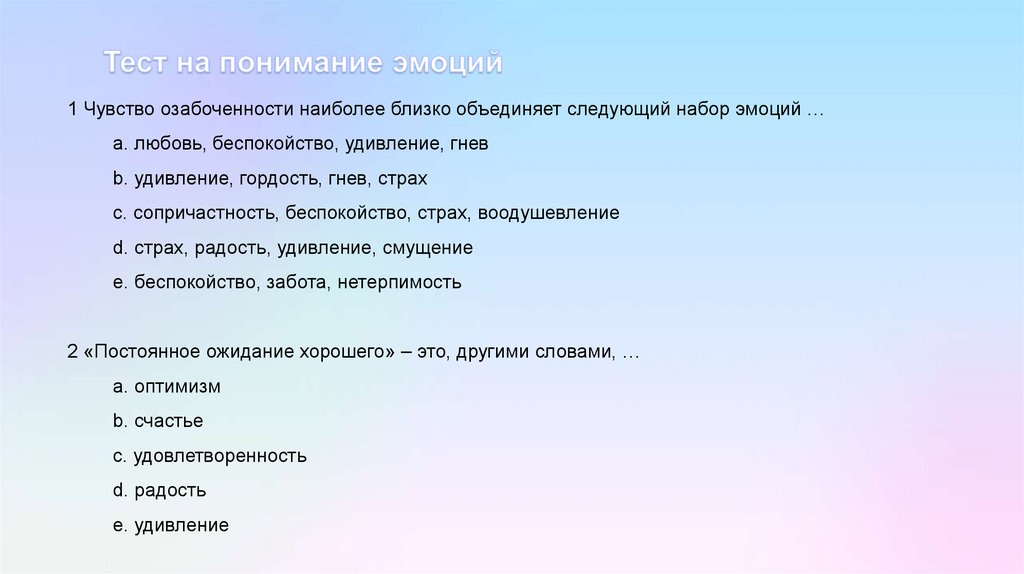 1 Чувство озабоченности наиболее близко объединяет следующий набор эмоций …a. любовь, беспокойство, удивление, гнев