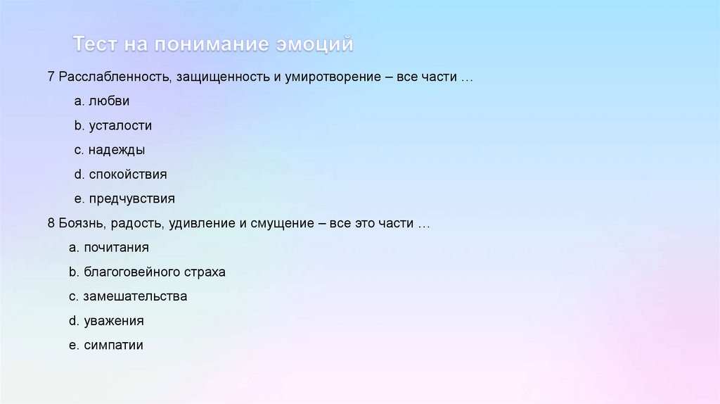 7 Расслабленность, защищенность и умиротворение – все части …a. любви