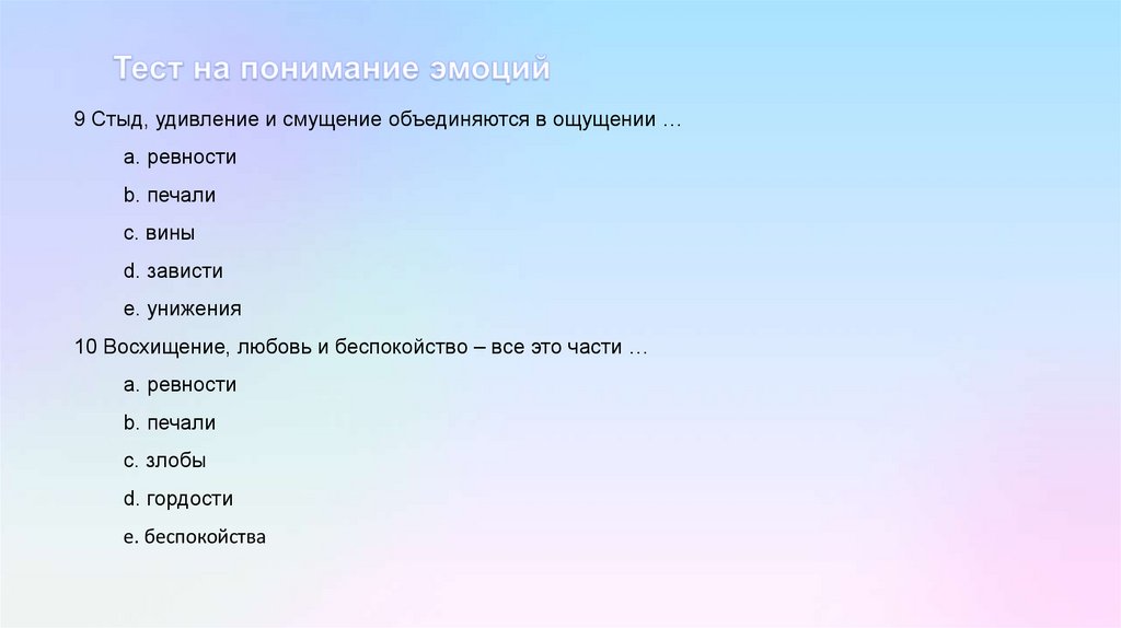 9 Стыд, удивление и смущение объединяются в ощущении …a. ревности