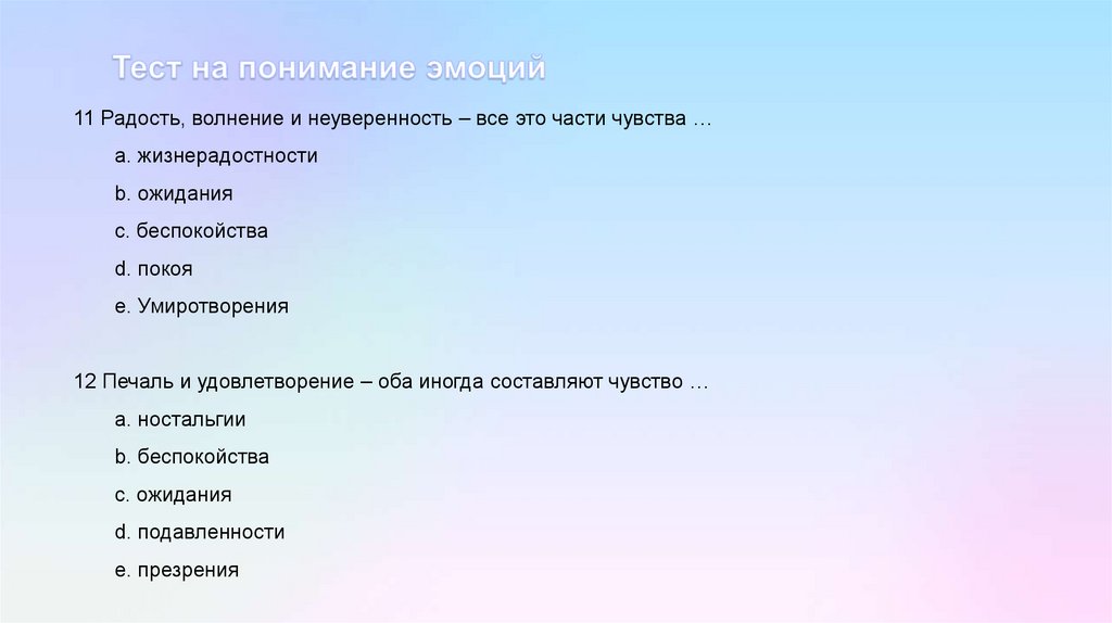 11 Радость, волнение и неуверенность – все это части чувства …a. жизнерадостности