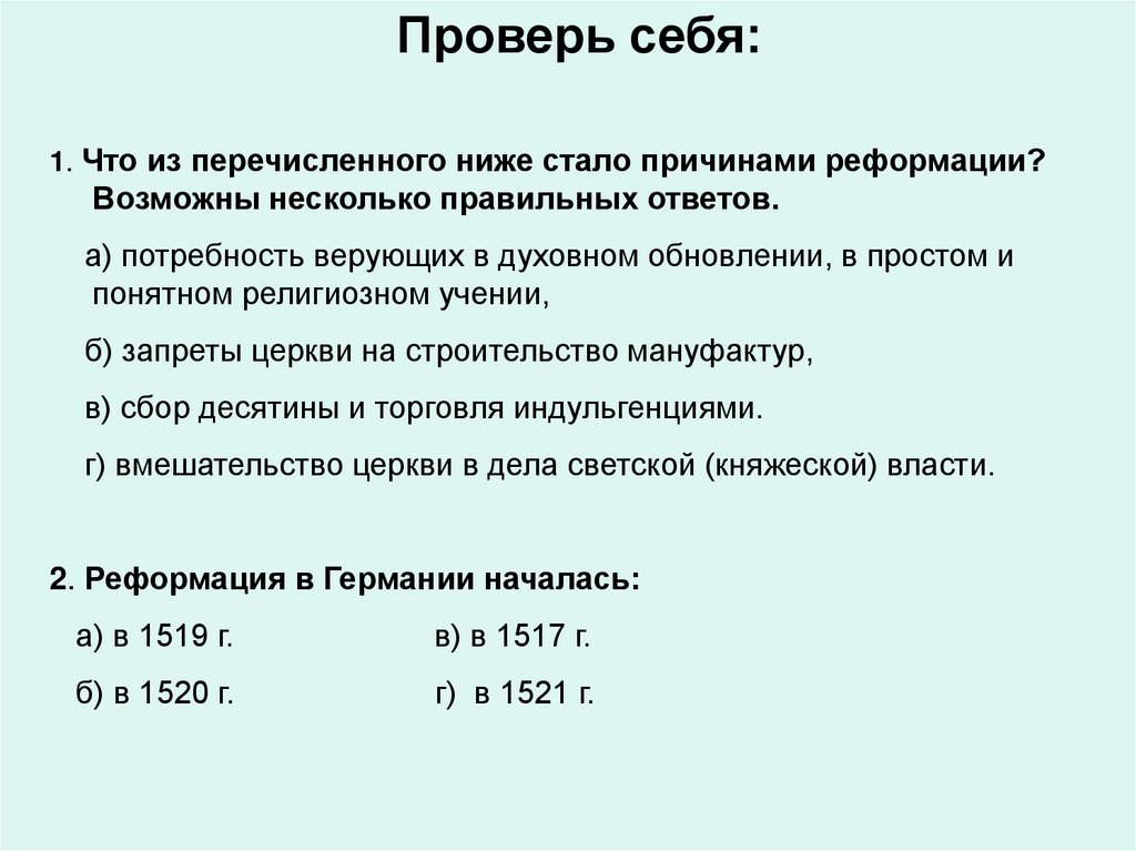 Проверь себя:1. Что из перечисленного ниже стало причинами реформации?