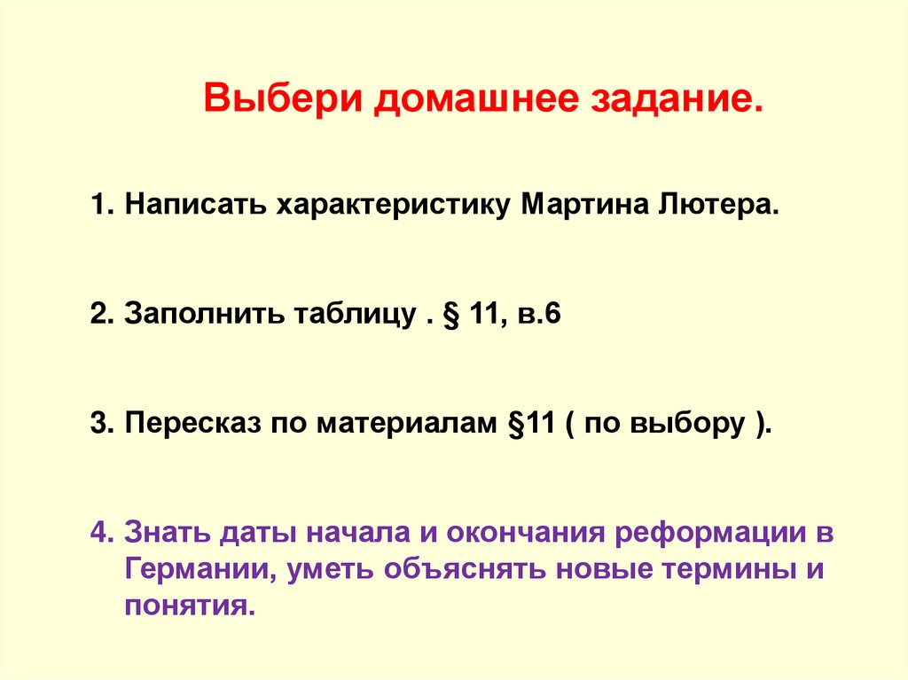 Выбери домашнее задание.1. Написать характеристику Мартина Лютера.