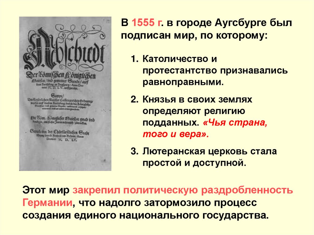 В 1555 г. в городе Аугсбурге былподписан мир, по которому: