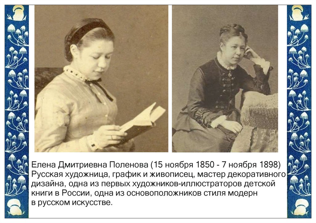 Елена Дмитриевна Поленова (15 ноября 1850 - 7 ноября 1898)Русская художница, график и живописец, мастер декоративного