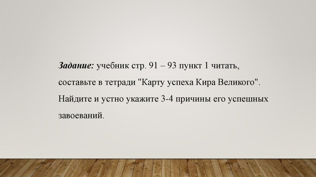 Задание: учебник стр. 91 – 93 пункт 1 читать,составьте в тетради "Карту успеха Кира Великого".