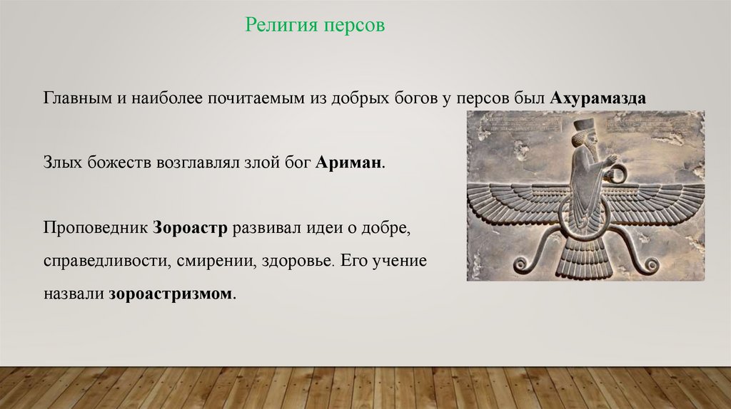 Религия персовГлавным и наиболее почитаемым из добрых богов у персов был Ахурамазда