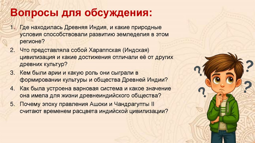 Вопросы для обсуждения:1. Где находилась Древняя Индия, и какие природные